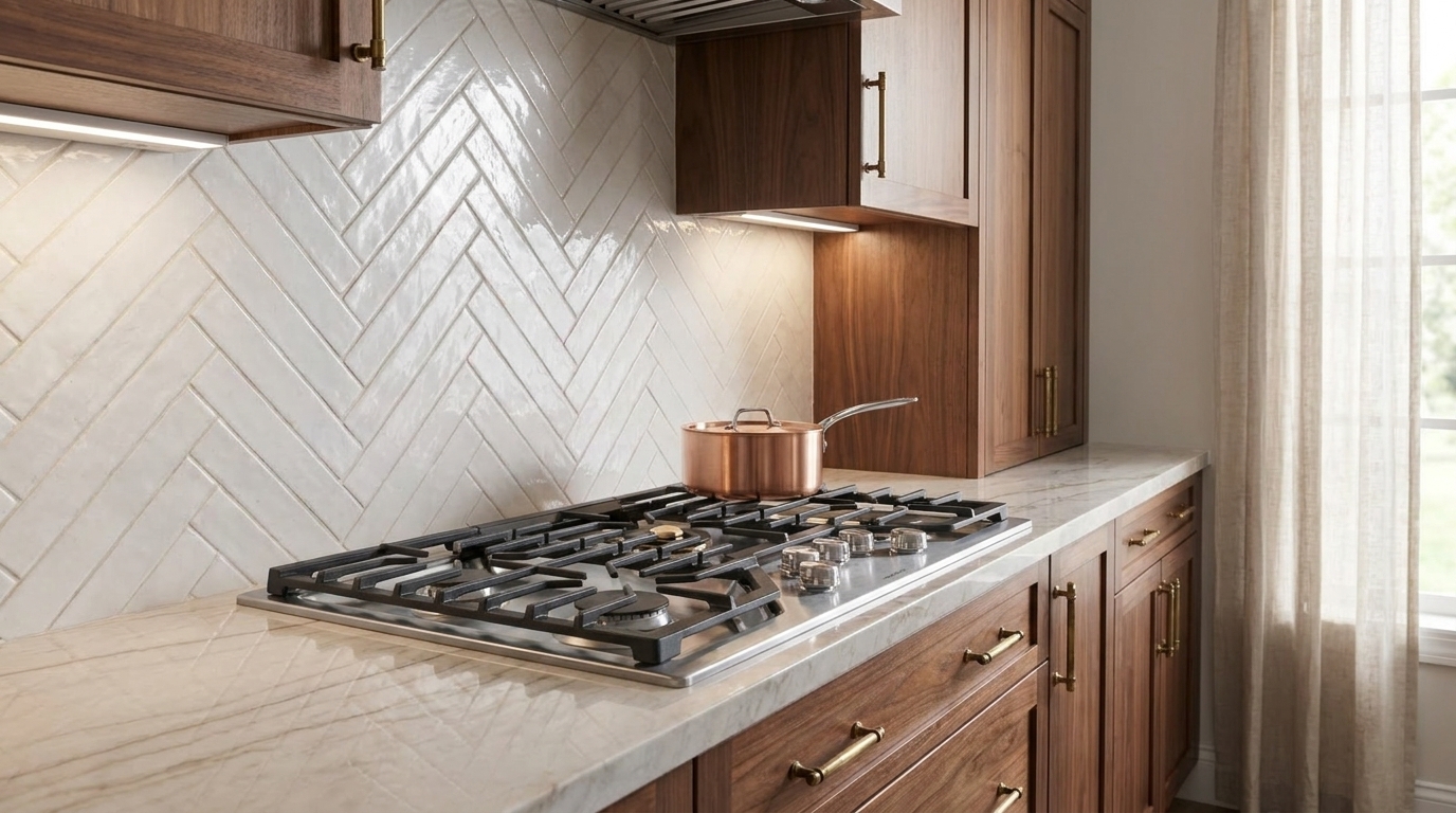 Premium gas cooktop styled in a quiet-luxury kitchen — one of the decisions behind a remodel gas vs. induction question